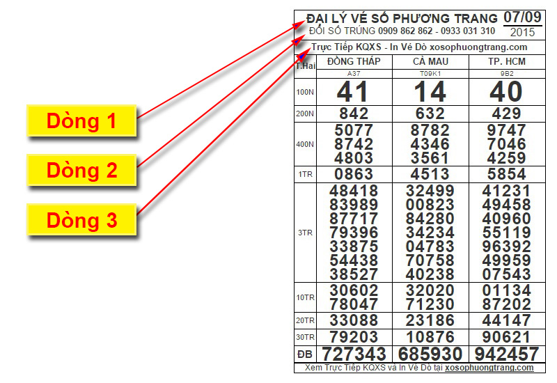 - Bước 3: Thay đổi Dòng 1 - Dòng 2 - Dòng 3 điền vào thông tin riêng của đại lý hoặc cơ sở in ấn. Chọn thứ tự và số đài cần in trong từng ngày theo thứ từ 1 đứng trước đến 2 đến 3 đến 4(Thứ 7), "bỏ" là không in đài đó, dấu * là để mặc định.