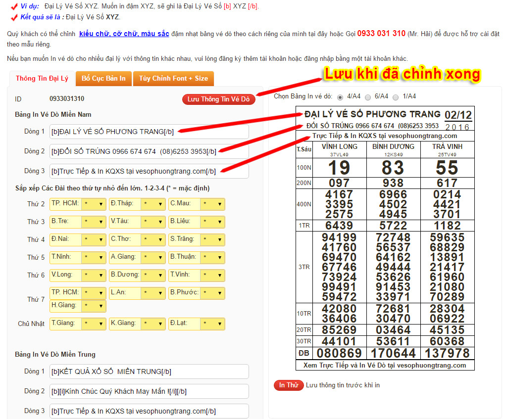 - Thay đổi Tên Đại Lý hoặc cơ sở in Ấn trên trang In Vé Dò (KQXS).